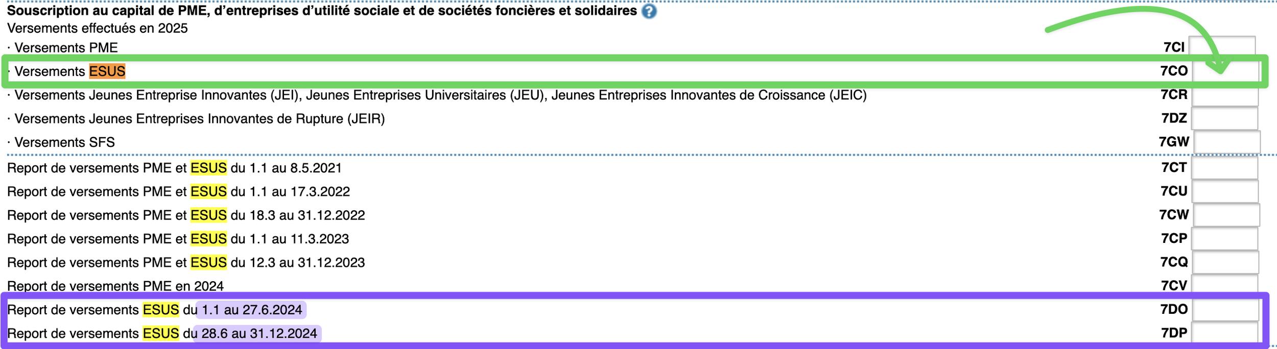 Le montant de votre investissement 2025 dans une entreprise ESUS est à reporter dans la case 7CO.